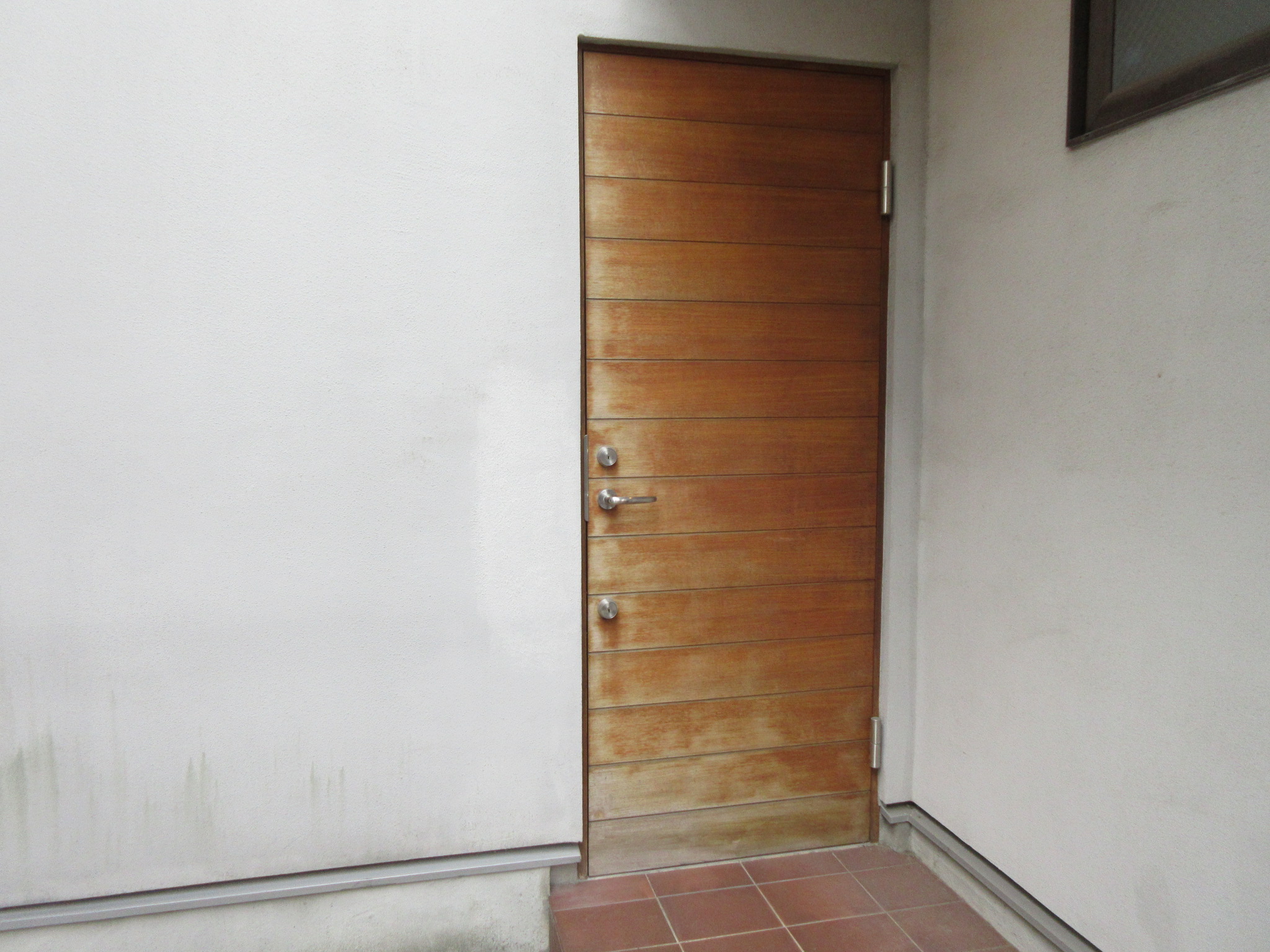前回の施工から3年近く経過しており、前回の木製窓枠や玄関扉も経年劣化で色落ちがあり、