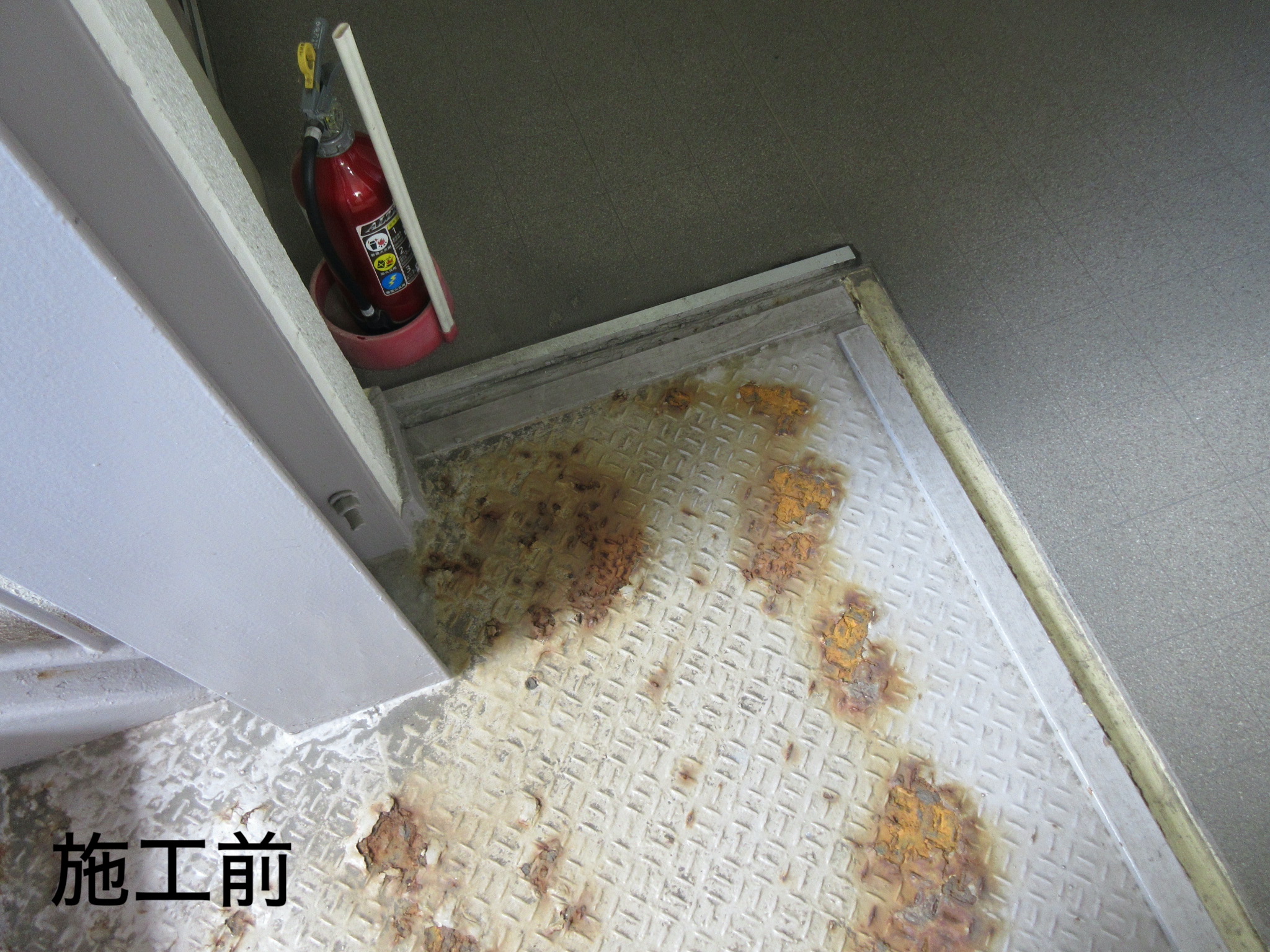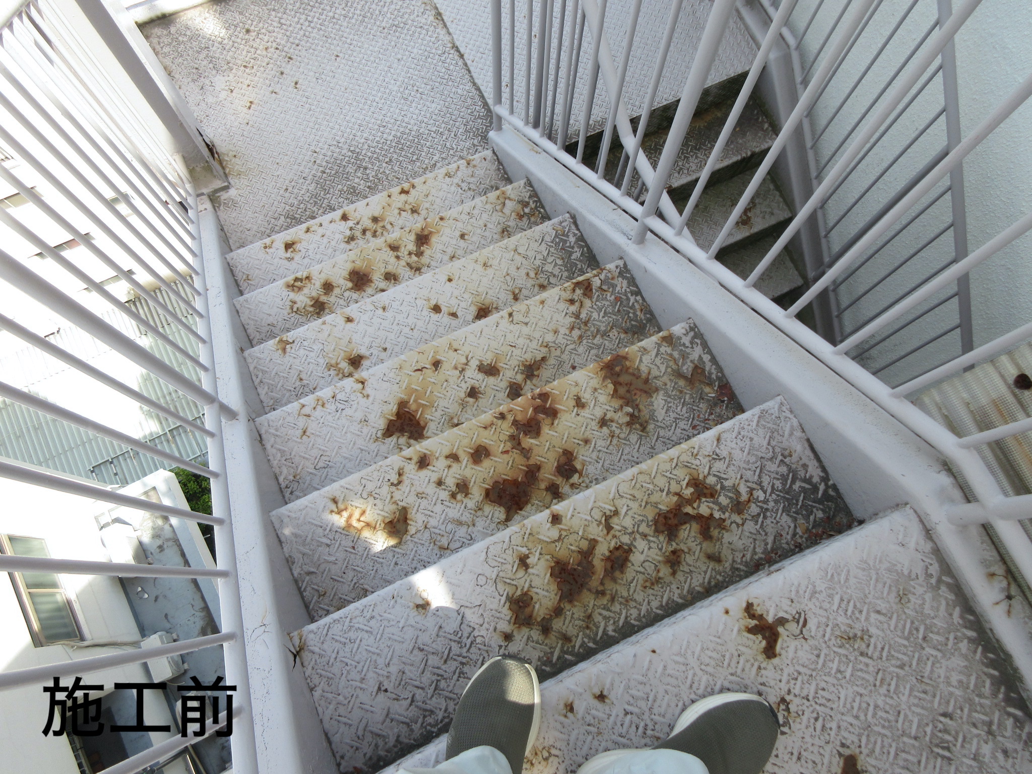 さて、施工時の状況ですが、とにかく鉄部の腐食個所が多く、特に階段の段裏部や各階踊り場の床の腐食が著しく、